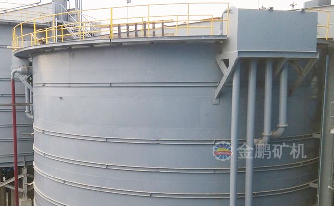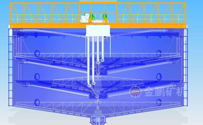 礦漿由給礦筒給入,自由沉降于耙子區的礦漿受刮板的壓力進一步濃縮,由耙子逐漸刮向池子中心,由排礦口靠重力排入下一層池子?清水經分配箱進入最下層對物料進行最后的洗滌,最下層的溢流返回分配箱進入第二層對物料進行洗滌,第二層的溢流返回分配箱進入第一層對物料進行洗滌,第一層的溢流經溢流堰排出,經三次洗滌的物料經底部排出。