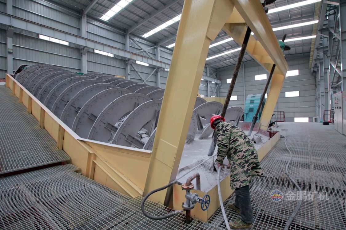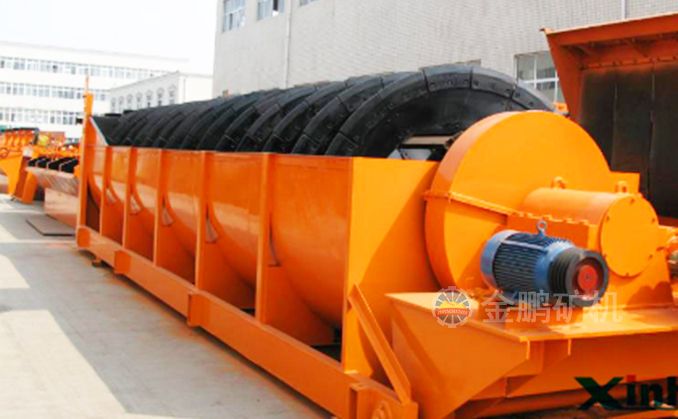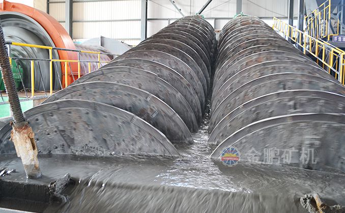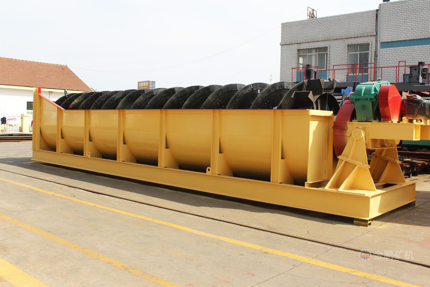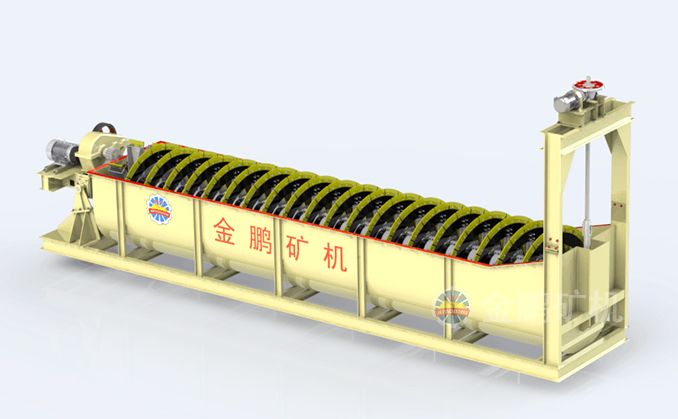 高堰式螺旋分級機采用將磨細(xì)后的礦漿從位于沉降區(qū)中部的進(jìn)料口給入水槽,傾斜安裝的水槽下面是礦漿分級沉降區(qū),螺旋低速轉(zhuǎn)動,對礦漿起攪拌作用,使細(xì)顆粒懸浮到上面,流到溢流堰處溢出。粗顆粒沉到槽底,由螺旋輸送到排料口作為返砂排出。溢流堰的位置高于螺旋軸下端的軸承中心,低于溢流端螺旋上緣。